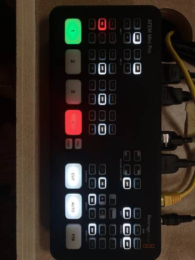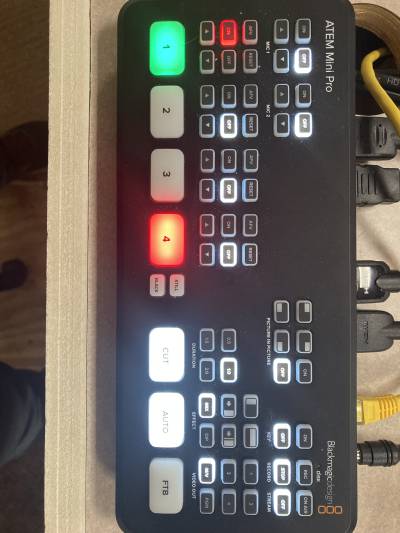 At the beginning of sound check, make sure both projectors are off before plugging in the ATEM. Once it is powered up, they can be turned on without breaking the Proclaim display settings. If a projector should show an incorrect image or the Proclaim slides are not showing up in the production display, power cycle the ATEM. If that doesn't work, power cycle the projectors. If Proclaim is not updating the slides on the production display, Go to Proclaim's settings and select the lower thirds display. Deselect the output, and reselect it. On closing the dialogue, all should be working again.